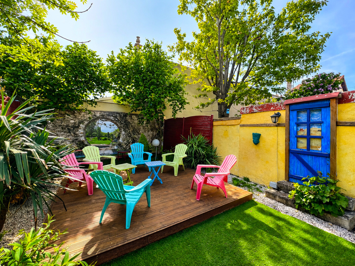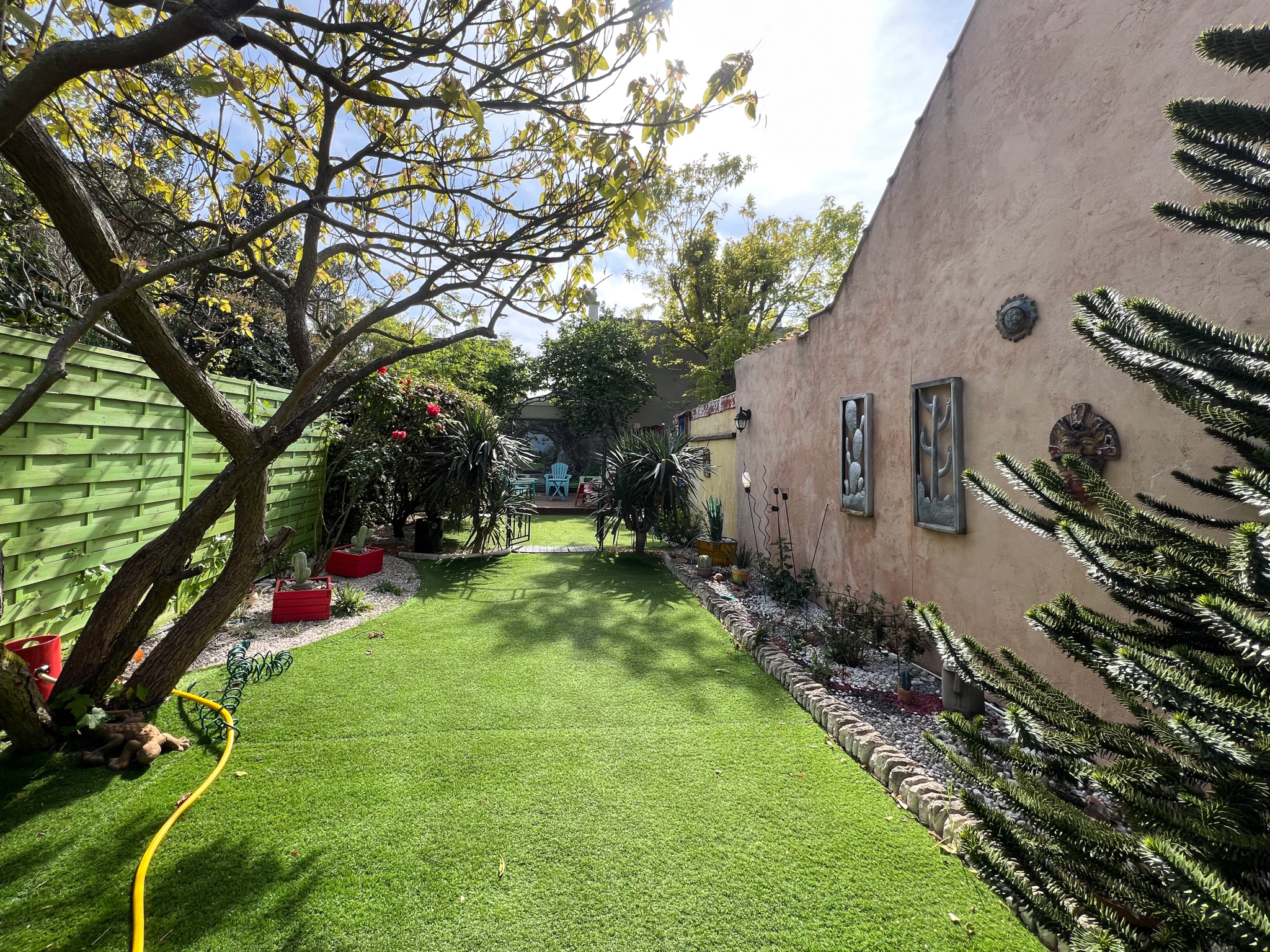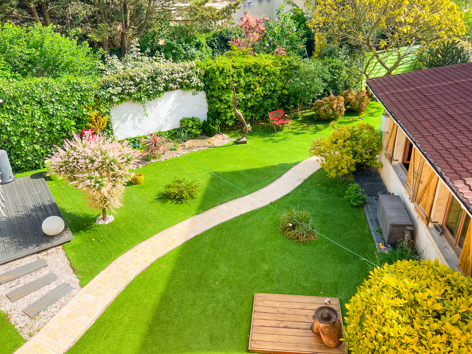 Véritable havre de paix, l’extérieur a été soigneusement aménagé pour prolonger les lieux de vie et offrir un cadre privilégié à chaque instant. Le jardin paysagé, entièrement à l’abri des regards, jouit d’une exposition optimale et d’un calme absolu. Deux terrasses à l’arrière invitent à profiter des beaux jours : repas en plein air, moments de détente, soirées conviviales… Une troisième terrasse, située à l’avant de la maison, offre un espace plus intimiste, idéal pour savourer un café matinal ou un moment de lecture au soleil.