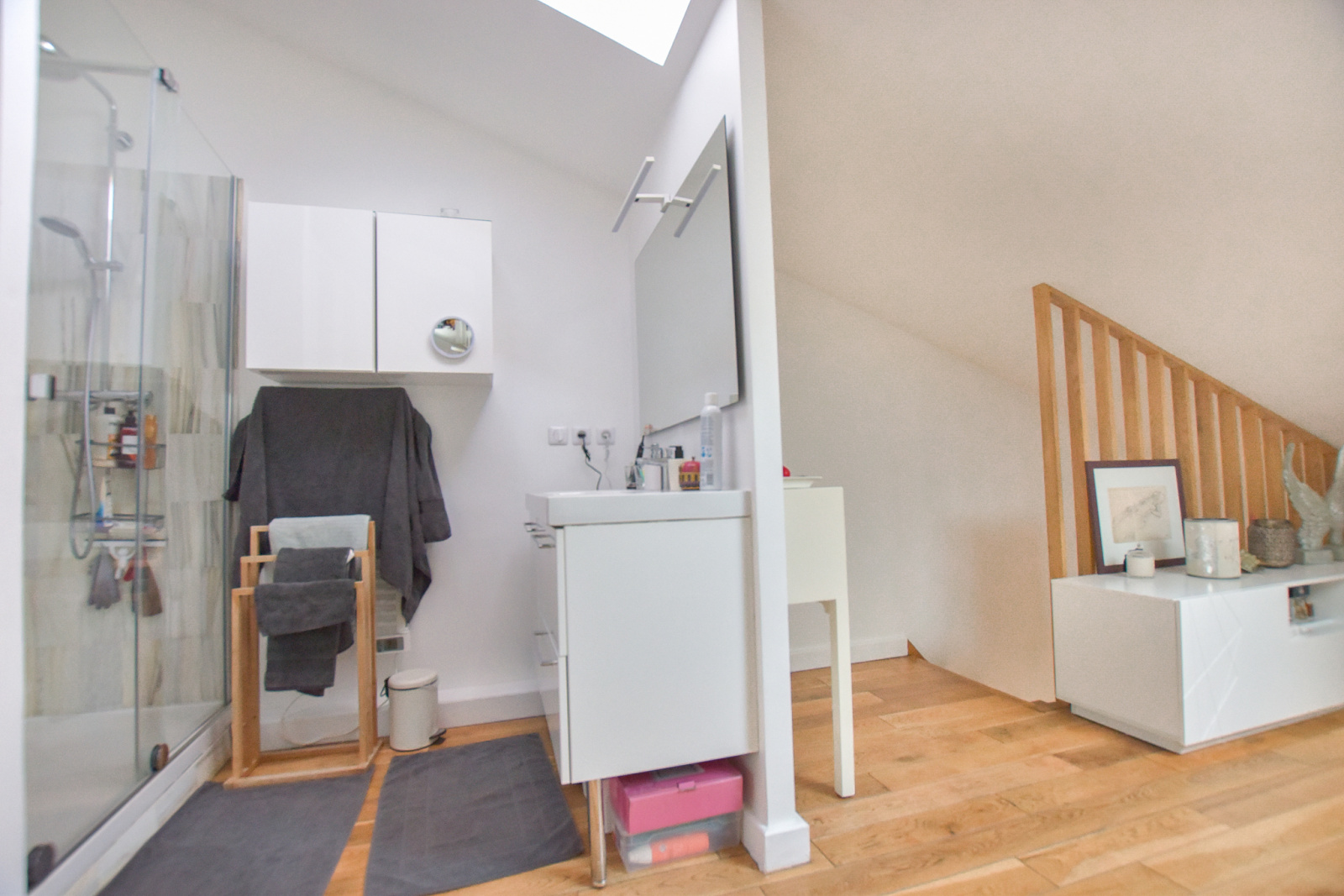 À l'étage, deux chambres, une salle de douche à l'italienne et un WC séparé vous attendent, accompagnés d'un espace mezzanine propice à la détente ou à la création d'un coin bureau.