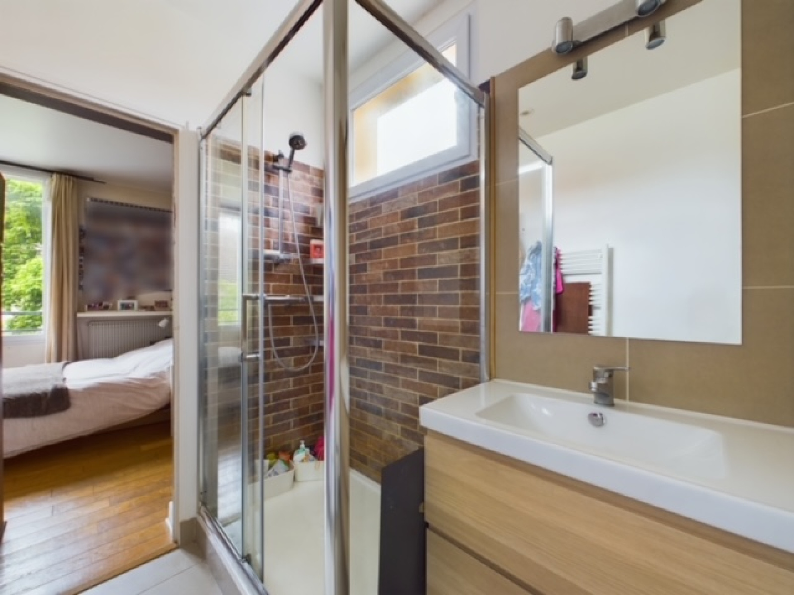 À l’étage, trois chambres spacieuses et lumineuses offrent un confort optimal. Deux d’entre elles disposent de leur propre salle de bain, assurant une intimité appréciable.