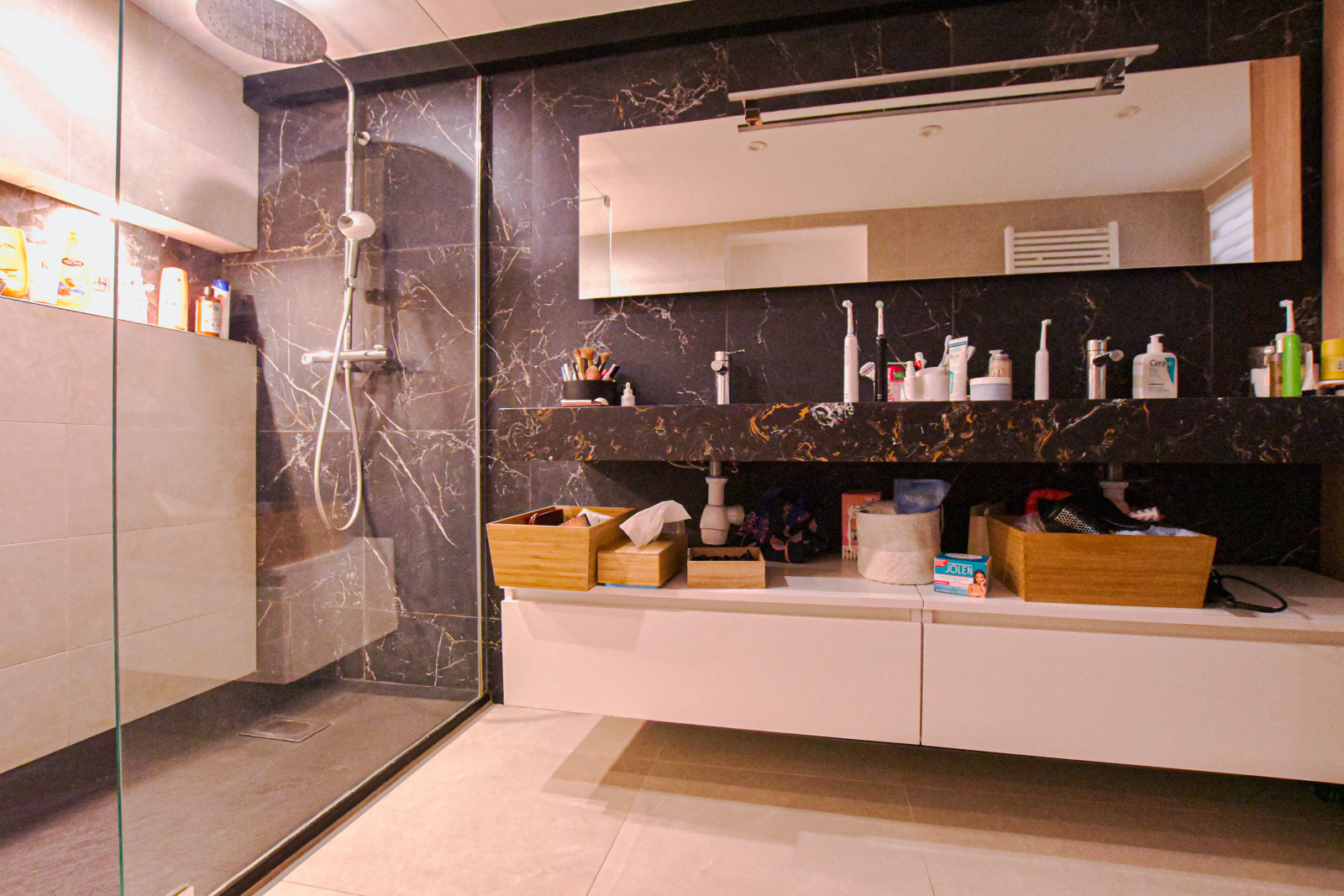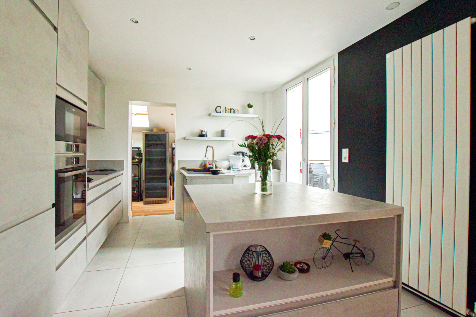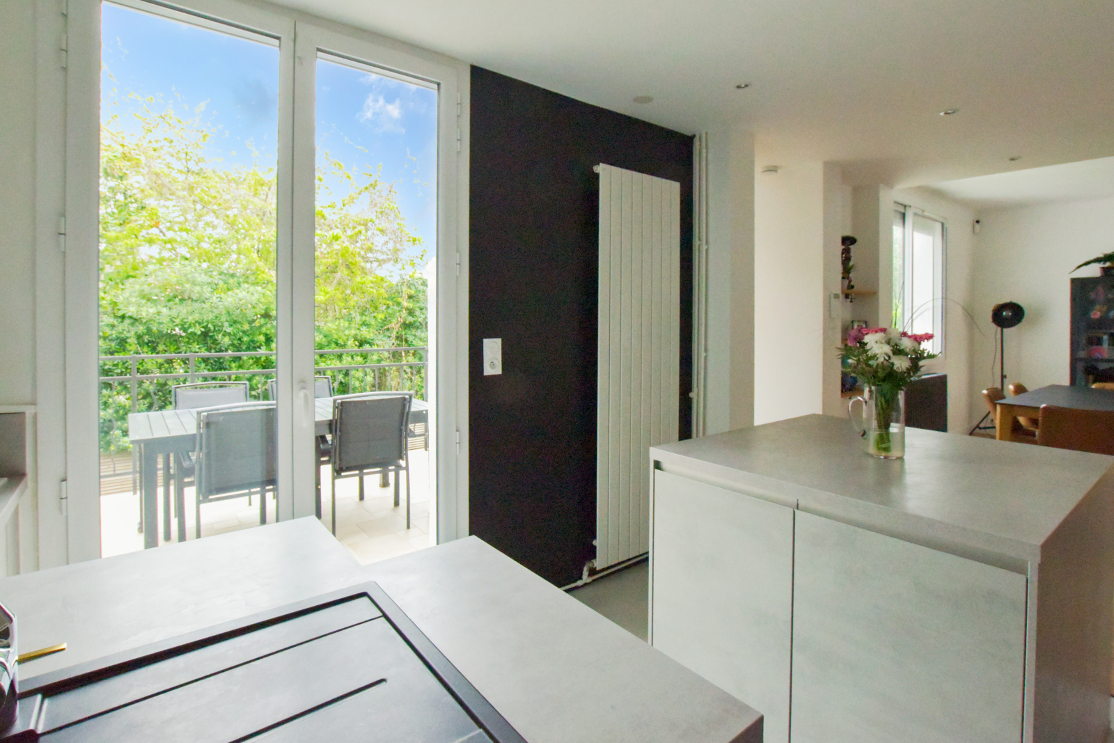 Dès l’entrée, les volumes généreux et la lumière omniprésente confèrent à l’ensemble une atmosphère chaleureuse et raffinée. Le vaste espace de réception de 45 m², véritable cœur de la maison, se distingue par ses proportions et sa convivialité. Il accueille un séjour baigné de lumière, prolongé par une cuisine américaine haut de gamme entièrement équipée, pensée comme un lieu de partage et de vie. Cet espace s’ouvre naturellement sur une terrasse exposée Sud-Ouest, offrant un cadre idéal pour profiter des extérieurs en toute intimité.