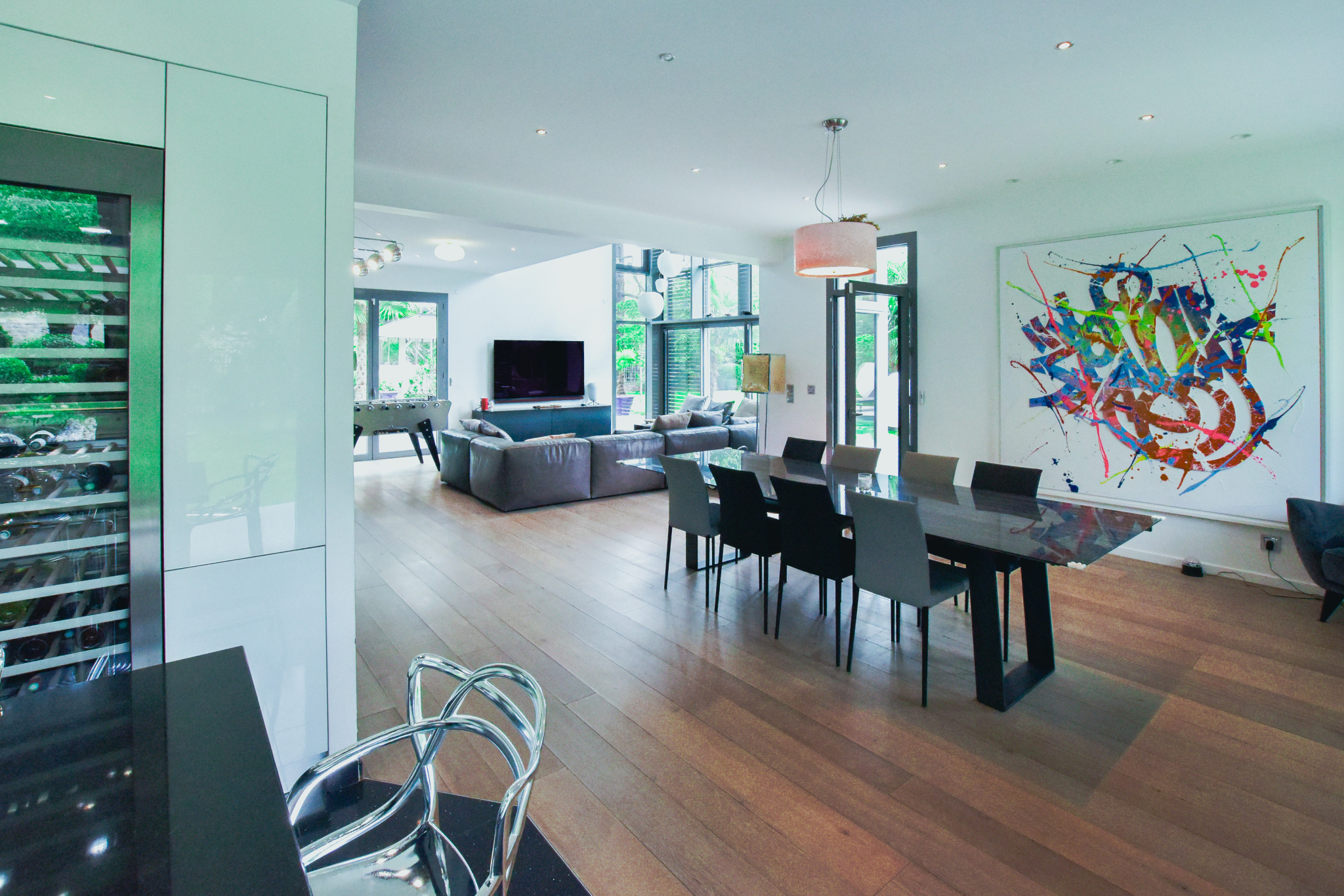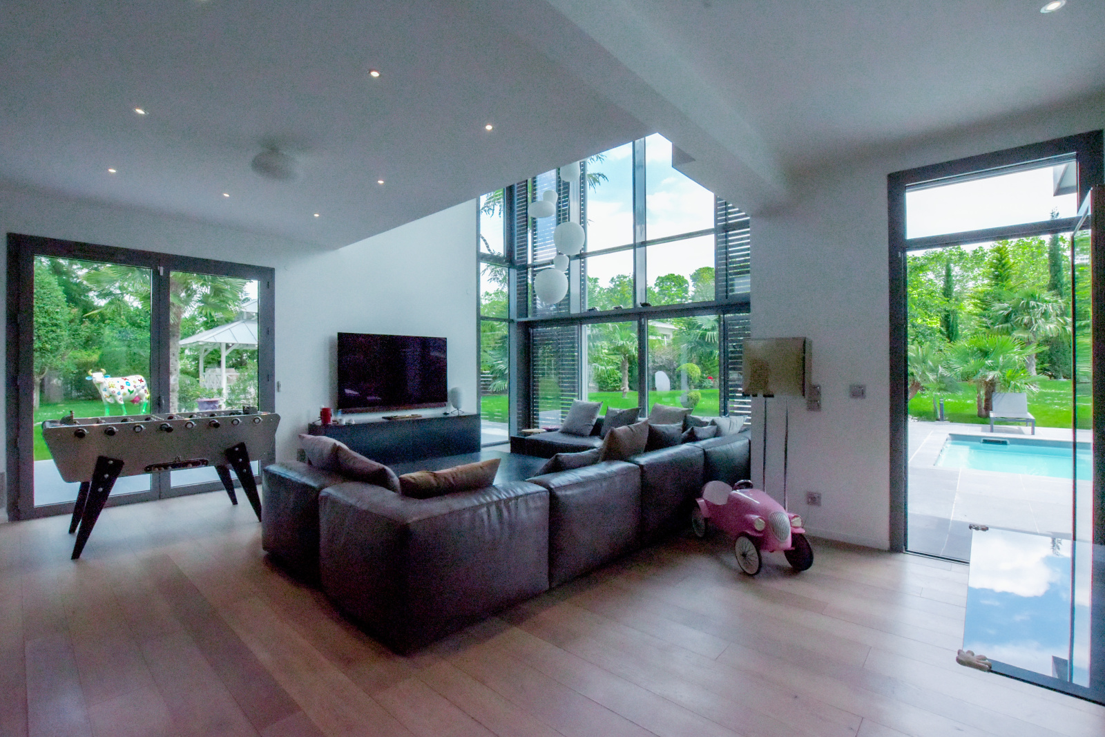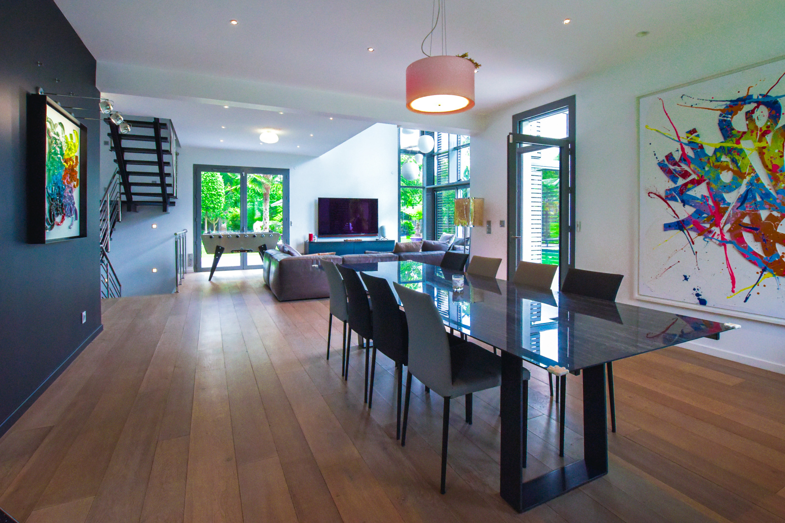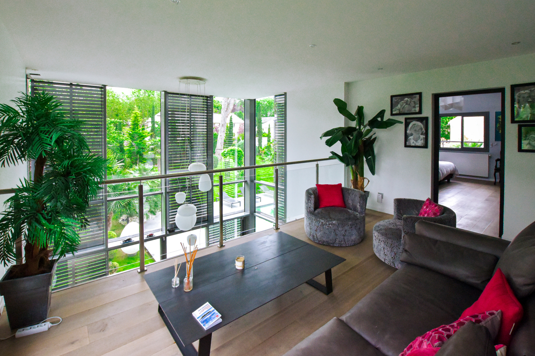 Dès l'entrée, l'intérieur de la villa impressionne par ses volumes généreux et sa luminosité exceptionnelle. Le salon, pièce maîtresse de la maison, se distingue par sa double hauteur sous plafond et sa mezzanine qui surplombe l'espace, créant une sensation d'ouverture et de grandeur. La cuisine dînatoire, moderne et parfaitement équipée, s'intègre harmonieusement dans cet espace de vie convivial. De larges baies vitrées s'ouvrent sur la terrasse et le jardin, inondant la maison de lumière naturelle et offrant une vue imprenable sur l'extérieur.