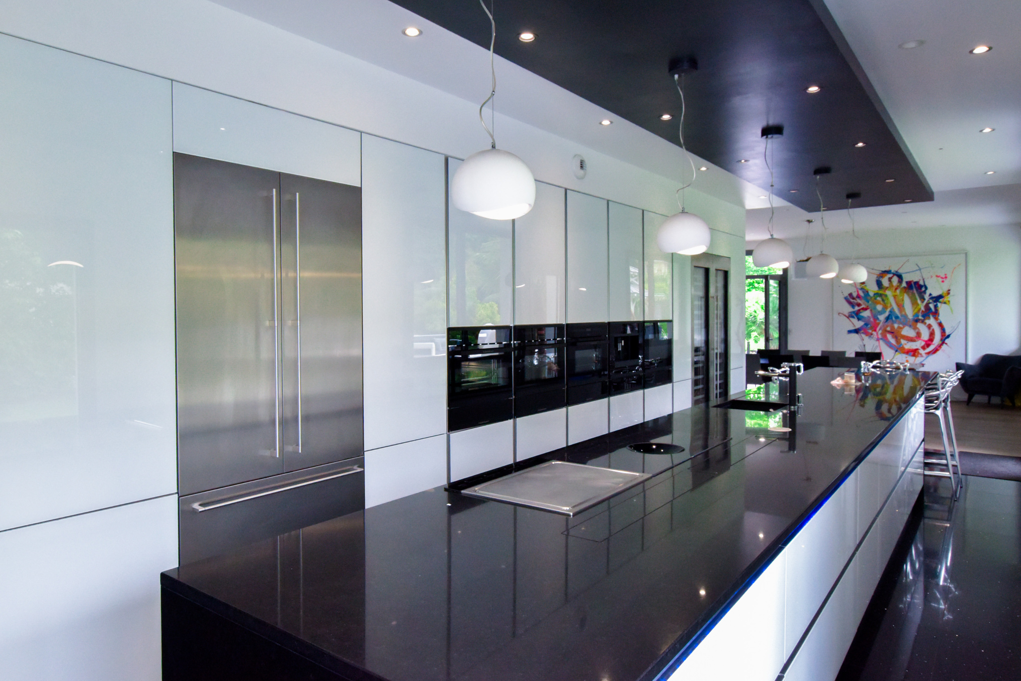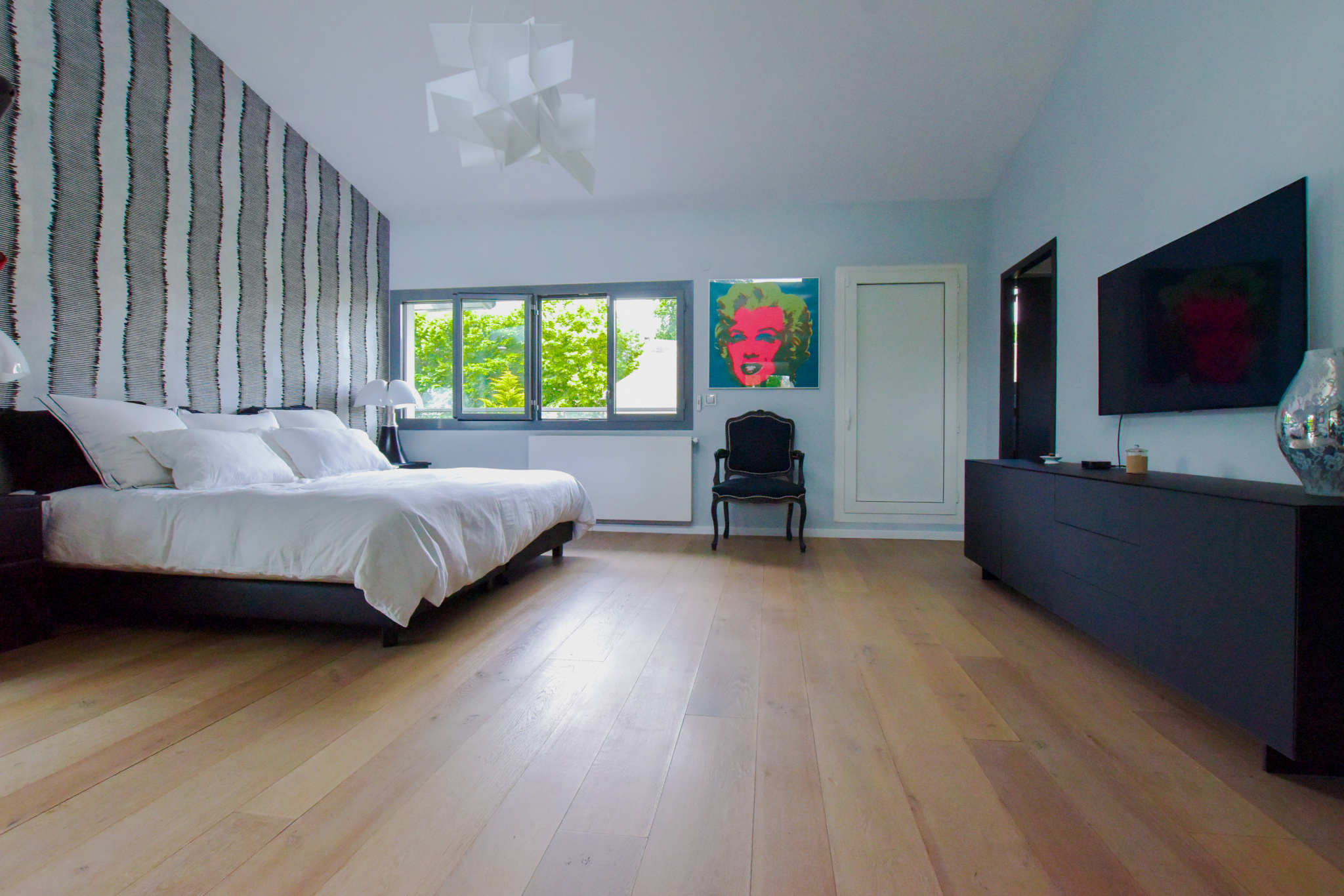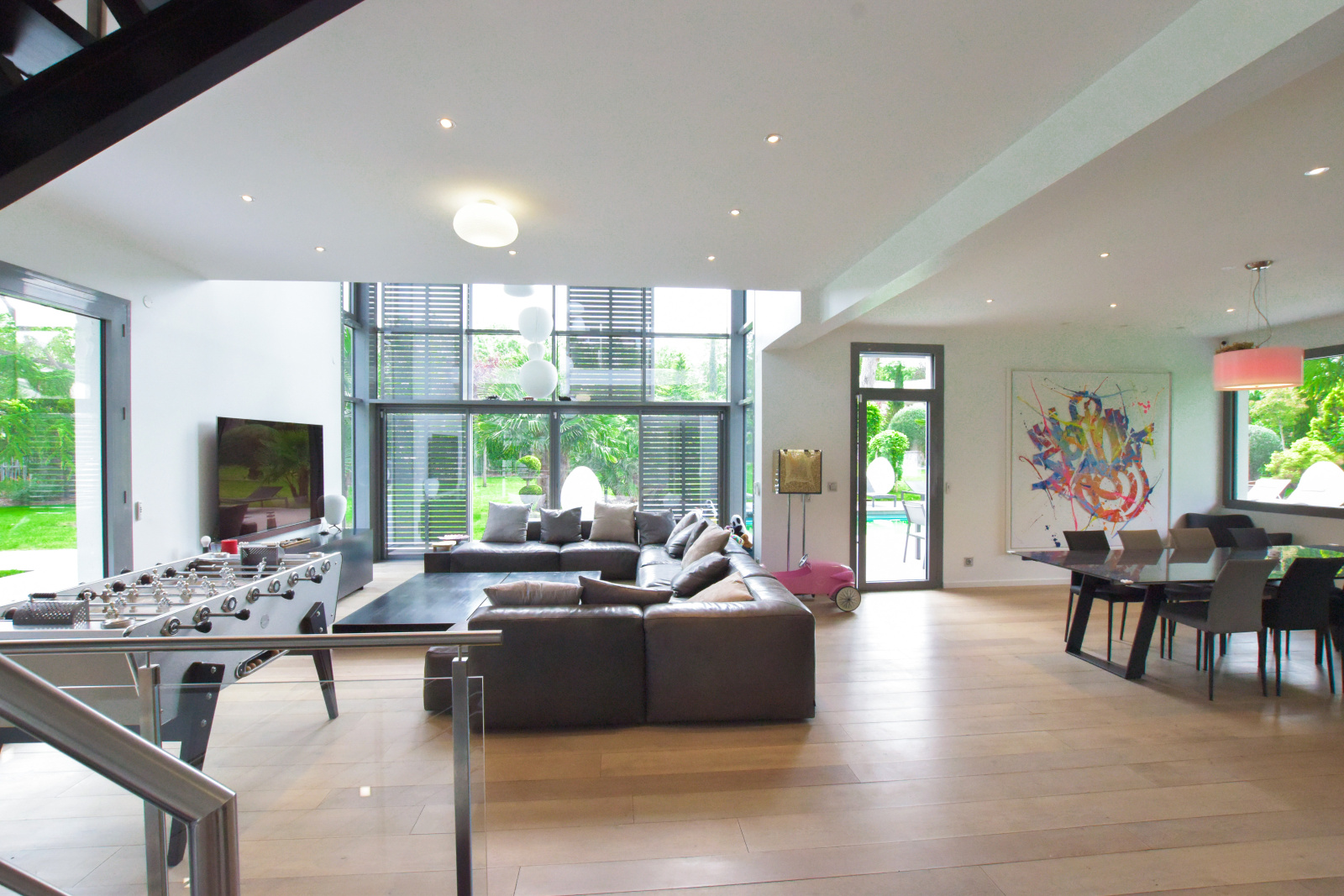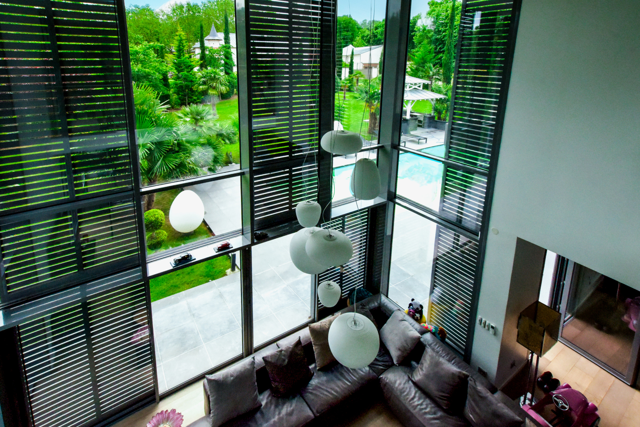 Dès l'entrée, l'intérieur de la villa impressionne par ses volumes généreux et sa luminosité exceptionnelle. Le salon, pièce maîtresse de la maison, se distingue par sa double hauteur sous plafond et sa mezzanine qui surplombe l'espace, créant une sensation d'ouverture et de grandeur. La cuisine dînatoire, moderne et parfaitement équipée, s'intègre harmonieusement dans cet espace de vie convivial. De larges baies vitrées s'ouvrent sur la terrasse et le jardin, inondant la maison de lumière naturelle et offrant une vue imprenable sur l'extérieur.