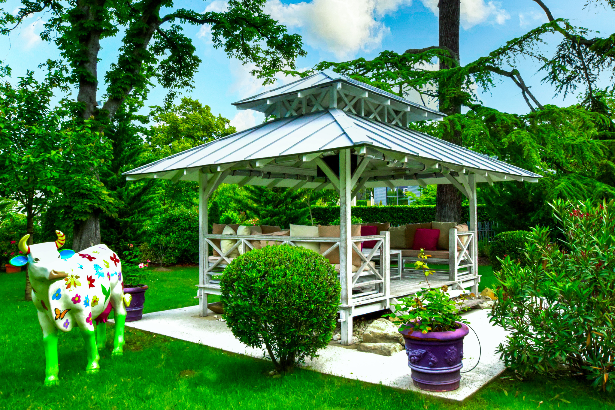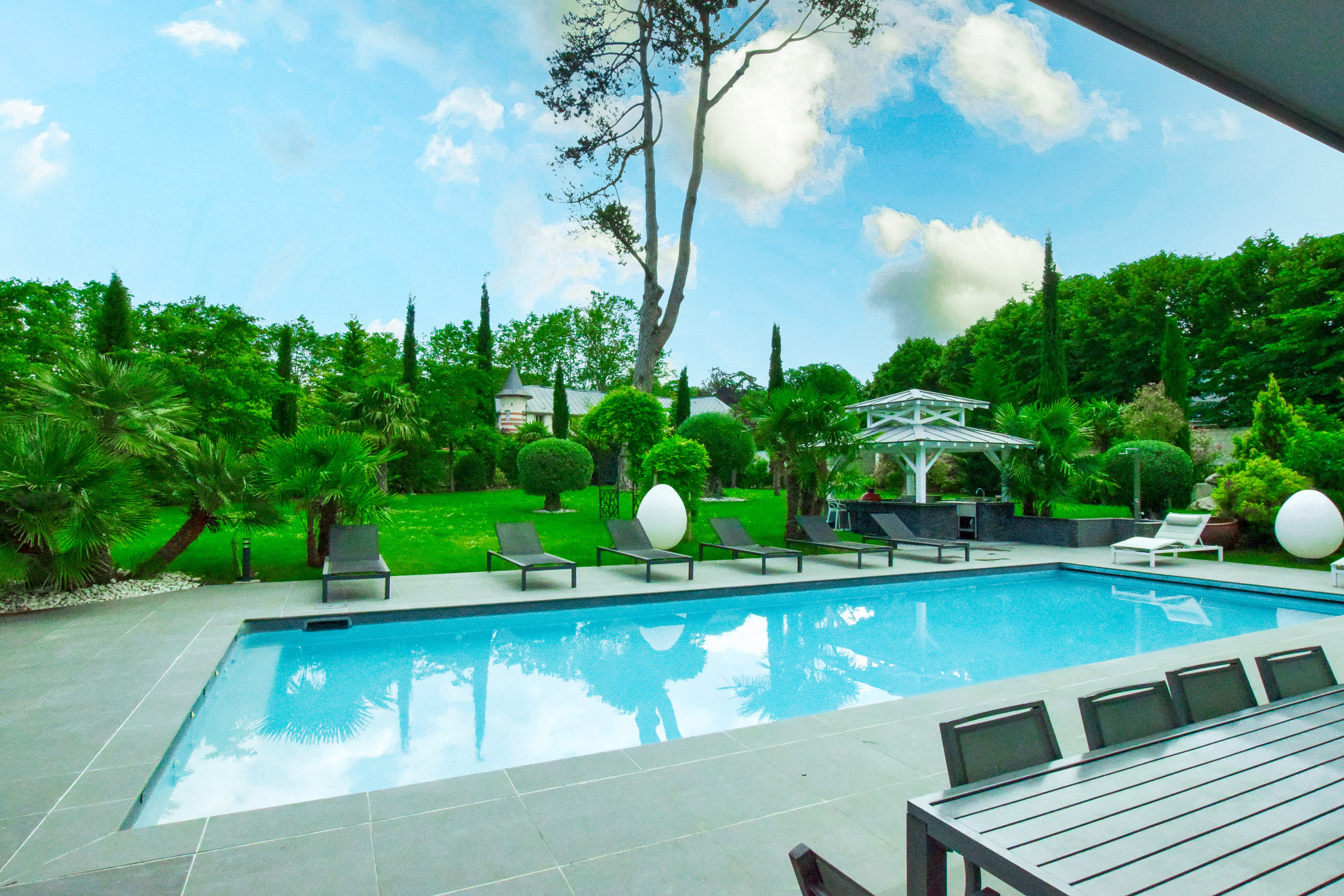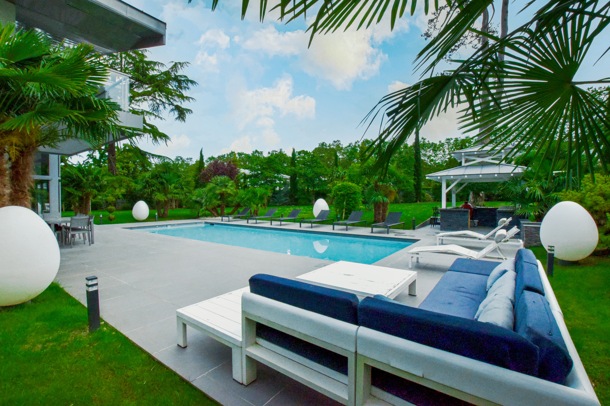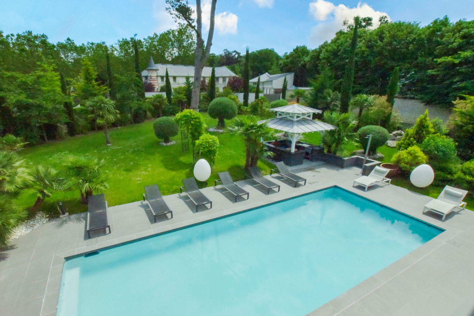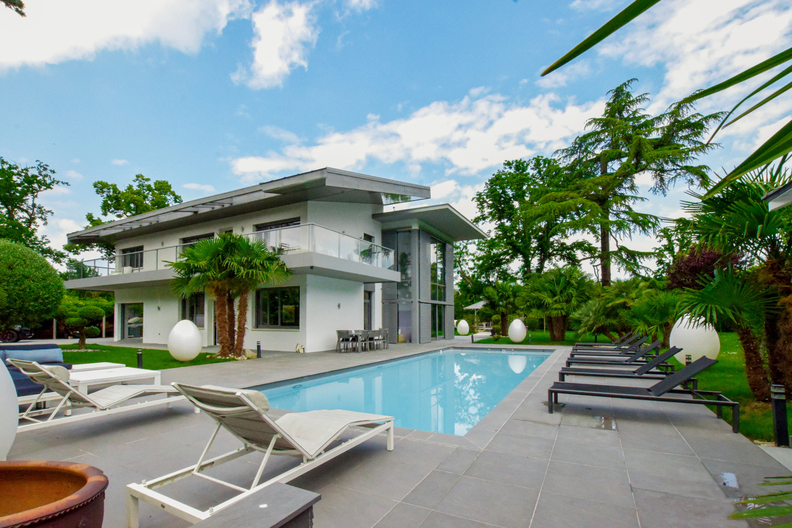 La villa principale, véritable chef-d'œuvre architectural, s'étend sur plus de 265 mètres carrés de surface habitable et 125 mètres carrés de sous sol aménagé. Elle repose sur un terrain somptueusement aménagé de 2 750 mètres carrés, où chaque détail a été pensé pour créer un espace harmonieux et accueillant. Le jardin, un véritable écrin de verdure, est agrémenté de plantes exotiques et méditerranéennes, d'une piscine scintillante aux reflets azur, et de charmantes paillotes balinaises qui invitent à la détente et à l'évasion. Trois places de stationnement sont élégamment abritées sous une pergola paysagère, offrant à la fois confort et esthétisme.