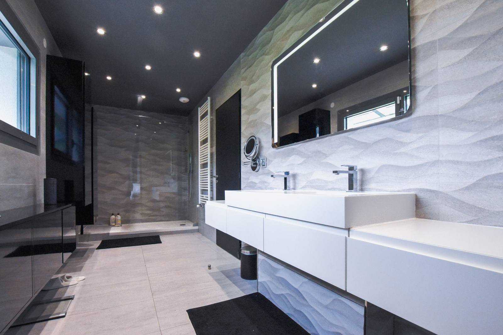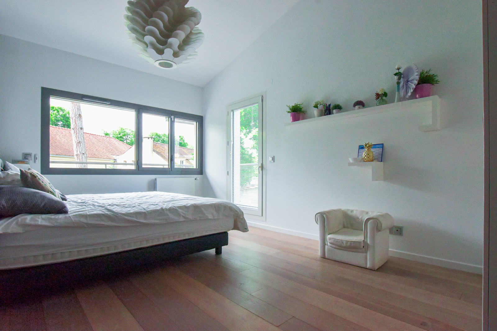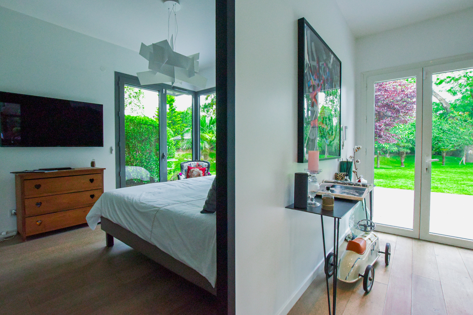 Le rez-de-chaussée abrite également une chambre confortable avec sa propre salle d'eau, idéale pour recevoir des invités ou pour un usage quotidien. À l'étage, la suite parentale est un véritable sanctuaire de tranquillité, dotée d'un vaste dressing et d'une salle de bains luxueuse. Deux autres chambres spacieuses, chacune avec leur salle de bains attenante, bénéficient d'un accès direct à des terrasses privées, offrant ainsi des espaces de repos intimes et privilégiés.